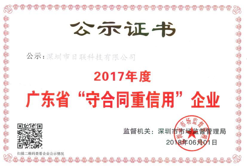 近日,廣東省工商行政管理局發(fā)布關(guān)于2017年度 “廣東省守合同重信用企業(yè)”的公告,日聯(lián)科技憑借十多年來(lái)的積累與信譽(yù),再度榮獲“守合同重信用企業(yè)”這一榮譽(yù)稱號(hào)。