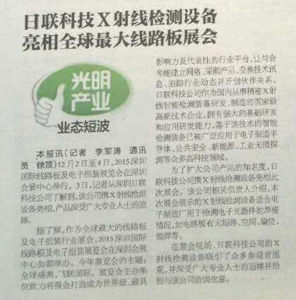 本次展會議題深入探討了智能自動化及工業(yè)制造4.0,由行業(yè)專家分享革新趨勢資訊及實用解決方案。日聯(lián)科技時刻緊跟科技步伐,公司所有X-ray檢測設備進行全面升級,全部配置智能化檢測軟件及云端后臺監(jiān)控系統(tǒng),完成智能制造產業(yè)的快速轉型。未來日聯(lián)科技繼續(xù)堅持走技術創(chuàng)新可持續(xù)發(fā)展道路,加快國際化的接軌。同時,吸收各行業(yè)人士提出的寶貴建議,多年以來為能爭取到各行業(yè)同仁的認可和友誼而感到高興。2015年馬上就要接近尾聲,日聯(lián)科技再次感謝各位行業(yè)同仁及客戶長期以來對公司的關心與支持,我們會提供更優(yōu)質的產品服務,期待更加精彩的2016年!