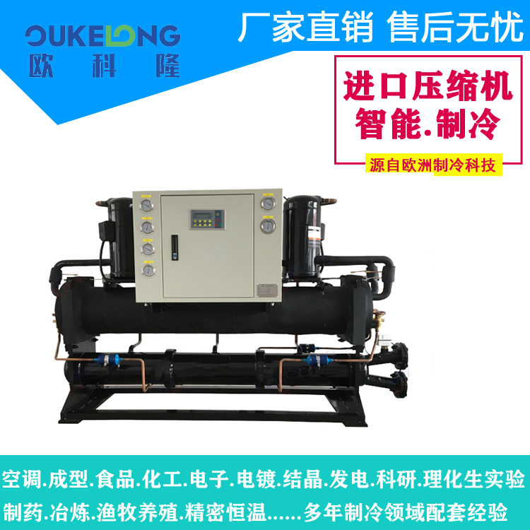 歐科隆牌水冷開(kāi)放式冷水機(jī)組適用于化工、電鍍、油墨、光纖、電子、醫(yī)療、工業(yè)設(shè)備冷卻、熱源冷卻、混凝土攪拌站、制造橋梁、(制混凝土、制橋梁專(zhuān)用冷水機(jī)型,性能比普通冷水機(jī)型高出30%,可以定做移動(dòng)式冷凍機(jī)組)等多種場(chǎng)合。