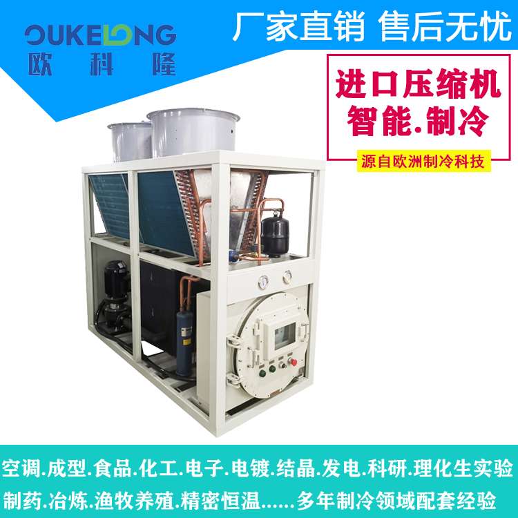 風(fēng)冷箱式防爆冷水機(jī),是歐科隆制冷打開市場(chǎng)的拳頭產(chǎn)品,歐科隆制冷擁有廣泛的防爆冷水機(jī)配套經(jīng)營(yíng),包括臭氧發(fā)生器,甲烷發(fā)電,化工化纖,石油天然氣,新型環(huán)保行業(yè)等,歐科隆防爆冷水機(jī)采用隔爆、增安、本安、正壓、充油、充砂、無火花、澆封和氣密等多種防爆方式,使機(jī)組可以在易燃易爆場(chǎng)合使用。