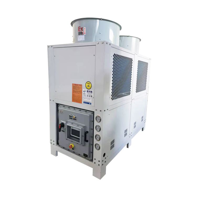 防爆冷水機(jī)主要應(yīng)用于易燃易爆的特殊場所,比如化工廠、油墨印刷廠、石油廠等等,制冷范圍從30kw到600kw之間可選,溫度也是可按要求制作,比如常用的5~35℃,0~-40℃之間,亦或者-40℃以下。這里給大家介紹的是螺桿式防爆冷水機(jī)。